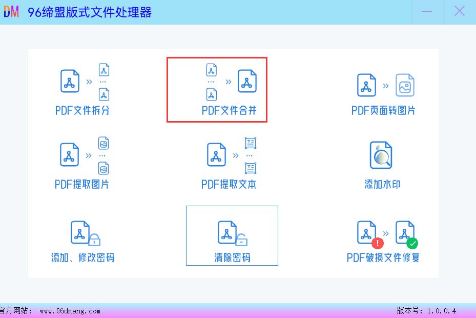 对于pdf文件的合并,可以非常简单的操作来完成,首先去官网下载最新版本的96缔盟pdf处理器,并正确安装(如果是下载的绿色版就可以直接解压后,点击PDFUtilTool.exe使用即可)