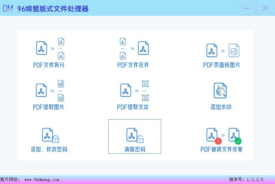 96缔盟PDF版式文件处理器 (下载地址:https://www.96dmeng.com/)是一款完全免费的PDF处理工具。操作简单实用,并且非常专业、高效、安全!而且虽然是免费使用,但也不会做在处理后的文件页面添加水印等流氓行为。